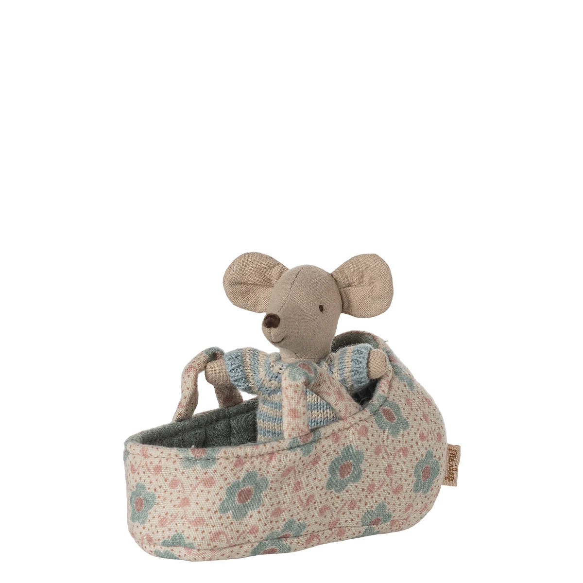 Lieferumfang: 1 Maileg Babymaus im blau gestreiften Strickanzug mit gesteppter Tragetasche. Lieferung ohne weiteres Zubehör.