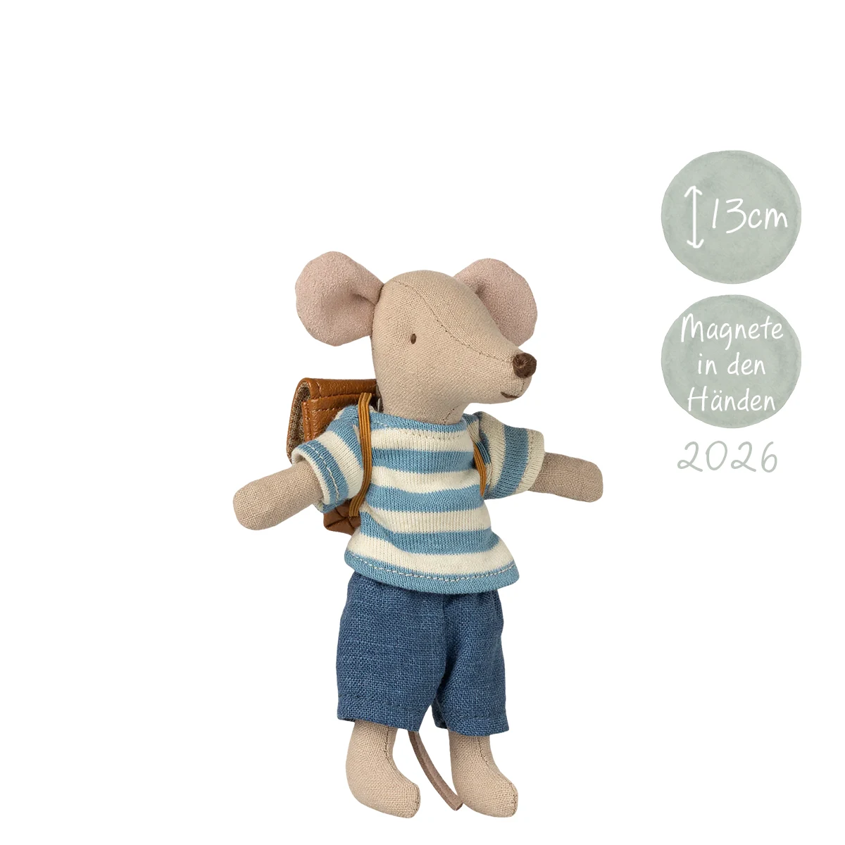 Lieferumfang: 1 Maileg Dreiradmaus “Großer Bruder” in Natur mit blauer Hose, blau-weiß gestreiftem Shirt und brauner Tasche. Hat Magnete in den Händen. Lieferung ohne Dreirad und ohne weiteres Zubehör.