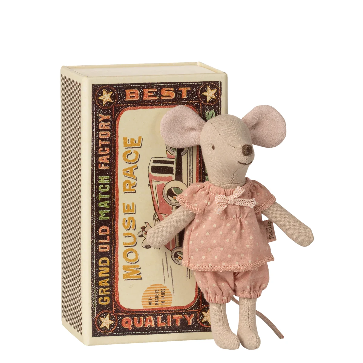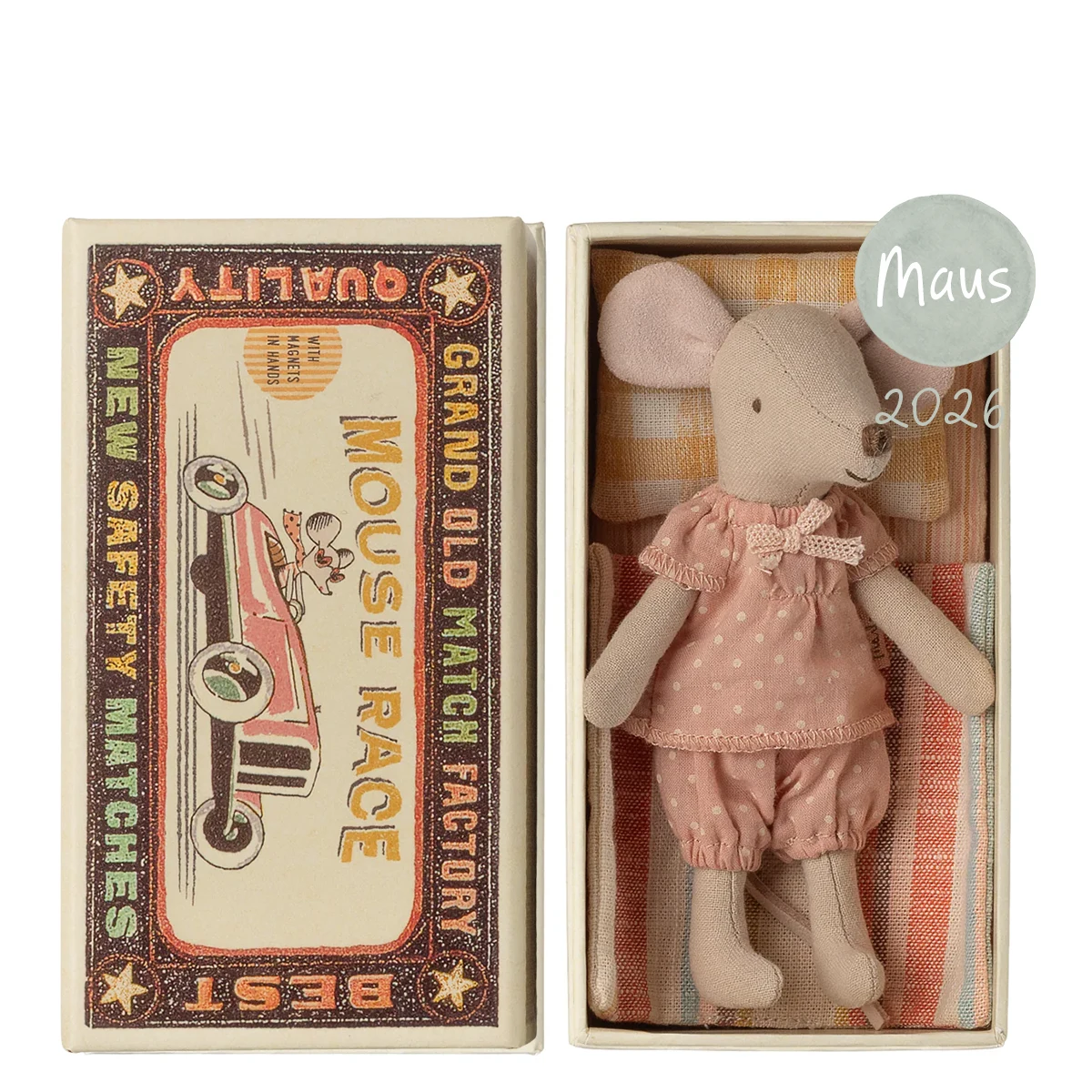 Lieferumfang: 1 Maileg Maus Große Schwester in der Streichholzschachtel. Kollektion 2026. Stoffe können variieren.