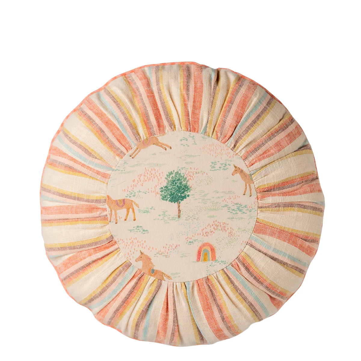 Lieferumfang: 1 Maileg Kissen ⌀ ca. 26 cm, wie abgebildet. Mit Einhorn-Stoff im Maileg Stil nach Dorthe Mailils Zeichnungen. Stoffausschnitt kann vom Foto abweichen. Lieferung ohne weiteres Zubehör.