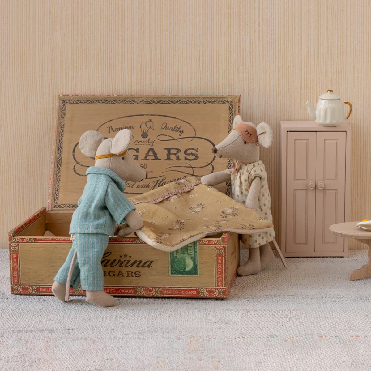 Lieferumfang: 1 Maileg Zigarrenkiste aus Karton mit Mama und Papa Maus, inklusive Schlafanzüge, Augenmasken, Matratze, Kissen und Bettdecke. Lieferung ohne weiteres Zubehör.