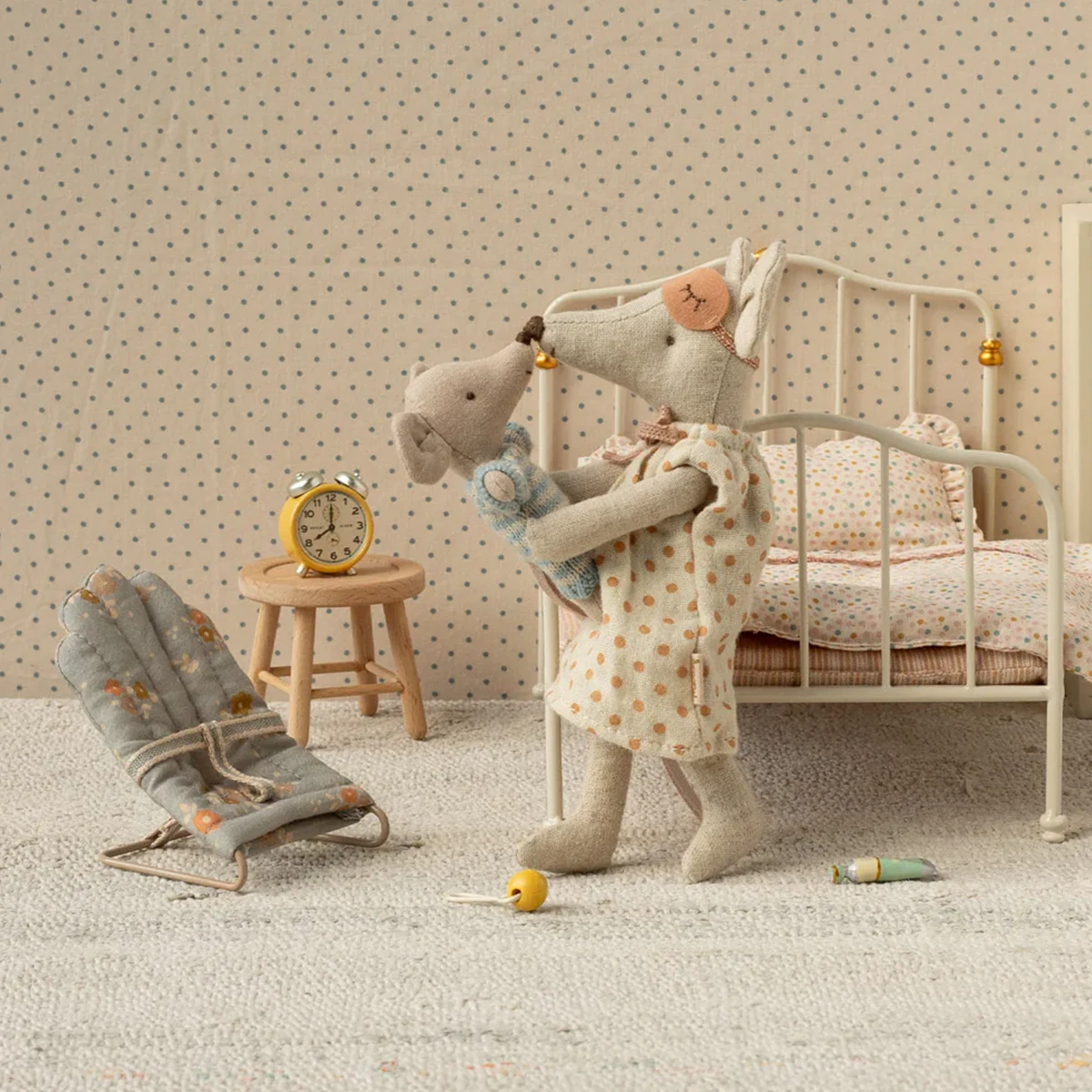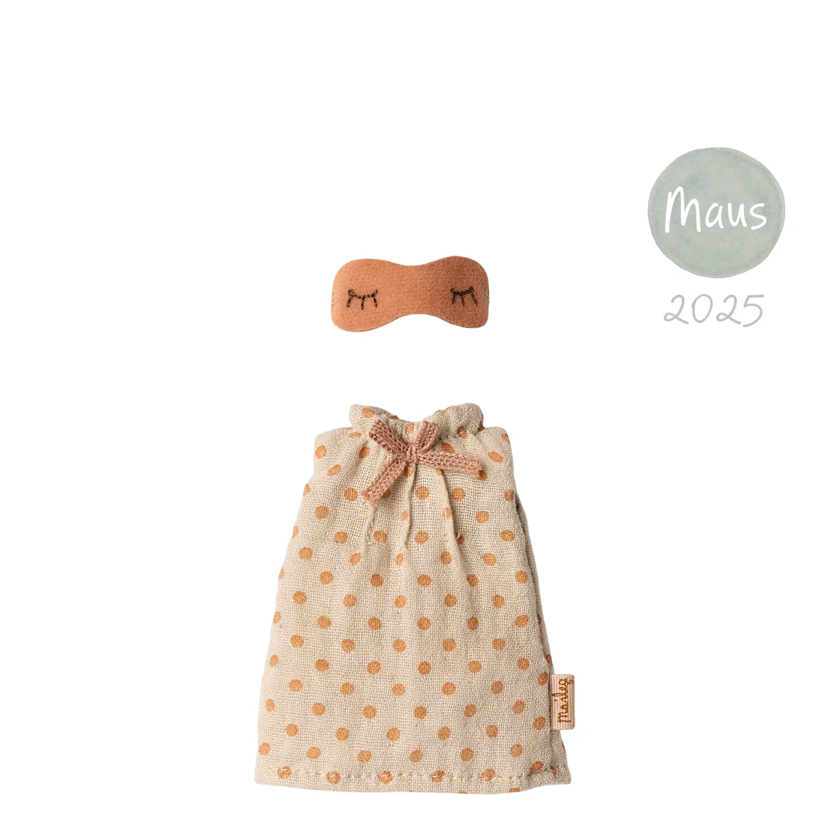 Lieferumfang: 1 Maileg Nachthemd in beige/grau mit Punkten inklusive Schlafmaske. Lieferung ohne weiteres Zubehör und ohne Maus.
