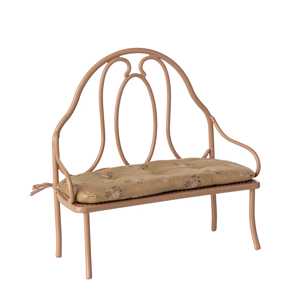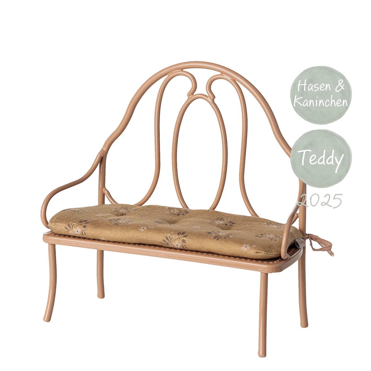 Lieferumfang: 1 Maileg Vintage Bankl in dunklem Powder (pudrigem Rosa) mit geblümtem Sitzkissen. Lieferung ohne weiteres Zubehör und ohne Hase/Kaninchen.